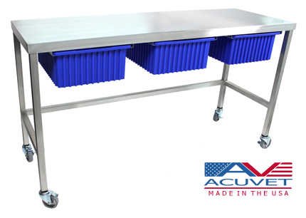 table is designed for economic storage and large work loads. The three under mounted tote bins act like storage drawers but are easily removable to transfer smaller items such as vet wrap, gauze, and other materials. A solid